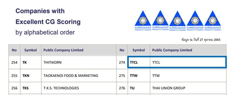 on October 27, 2022. TTCL has been rated as "Excellent" in CG Scoring for seven consecutive years.