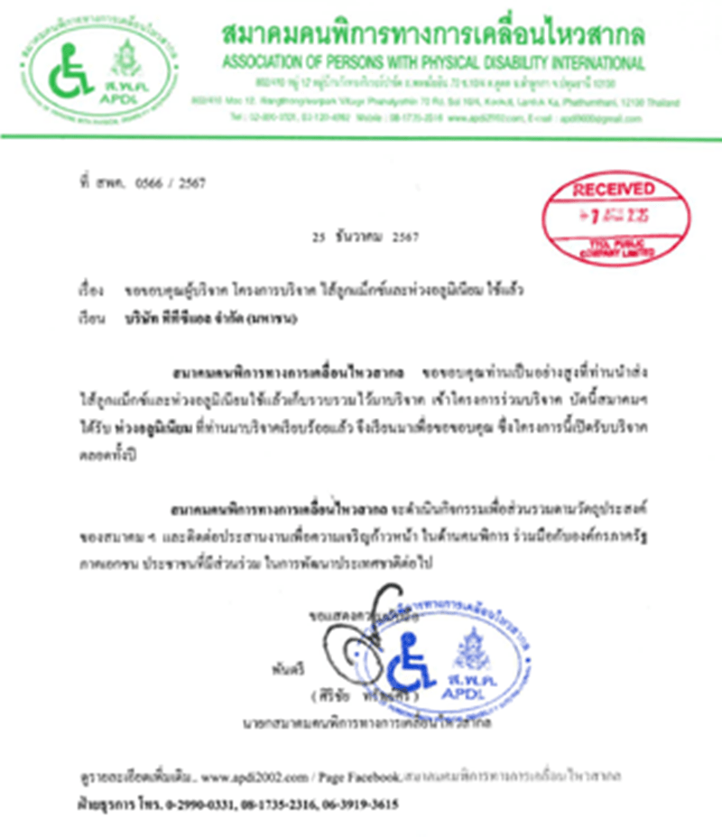On December, 2024, TTCL had donated the Aluminum to the Association of Persons with Physical Disability International under the “Aluminum For A New Life”